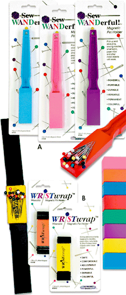Available colors for Sew Wanderful™ and WRISTwrap™ are light blue, yellow, purple, green, red, dark blue, orange and pink. WRISTwrap™ WEARABLE MAGNETIC PIN HOLDER Keeps pins, needles, paper clips, tacks and other metal items safely within reach, right on the wrist. The powerful, colorful magnet aligns the pins and needles for safety. The soft, 10-inch hook and loop adjustable fastener allows the magnet to comfortably fit most wrists. |