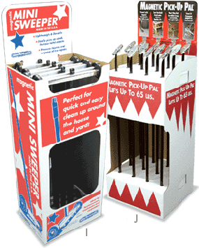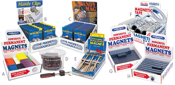 Eye-catching counter and floor displays with our most popular magnets will generate fast and easy sales! A. Part No. 07278DSP Hold Everything Magnets counter display, 56 magnets in eight colors, individually UPC labeled B. Part No. 07219DSP 18-pc. Handy ClipsT counter display------ Discontinue C. Part No. 07221DSP 24-pc. Handy MagT counter display D. Part No. 07224BIN 35-pc. Screwdriver Magnetizer/Demagnetizer Display E. Part No. 07228DSP 12-pc. Pickup/Pointers counter display F. Part No. MDZG1025AB Flexible Magnetic Tape display, 144 bulk coils, each with UPC label G. Part No. MDCB40CB3 Blocks Display contains 300 ceramic blocks, 3/16" thk. x 3/4" wide x 1" long with 3/16" center hole, and 200 solid blocks, 3/16" thk. x 1/4" wide x 7/8" long H. Part No. MDCD10CR75 Discs and Rings Display contains 300 ceramic disc magnets, 3/4" dia. x 3/16" thk., and 200 ceramic ring magnets, 3/4" outer dia. x 1/4" inner dia. x 1/4" thk. |