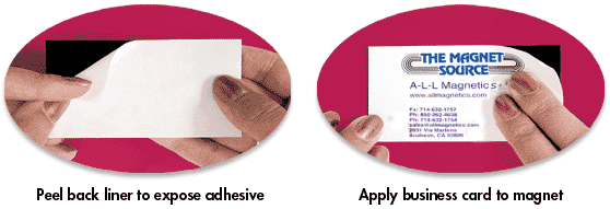 Magnetize your Business Cards Business contacts will display your magnetized cards on nearby metal desks, filing cabinets, appliances and more, keeping your card in full view! To assemble, simply peel back the magnet's adhesive liner and apply your business card. Magnetic cards measure 2" x 3.5" (+/- .060" on both dimensions) to fit standard business cards. Stock is on hand and ready for immediate shipment. Available in .020" or .030" thickness. |