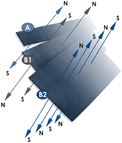 A. Conventional Magnetization: Has one pole on each side of the magnet - North pole on one side, South pole on the other. B. Multiple Pole (Standard): Two Poles (B1) or Multiple Poles (B2) on each side - two or more sets of poles on each surface are used in open circuit designs. North and South poles alternate through the thickness of the material. Steel backing is desirable where practical. |