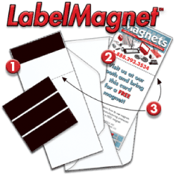 Flexible Magnetic Sheet designed for your labeling machine LabelMagnetT is available in 4.5" x 1" or 4.75" x 1" with .012" thru .030" thickness, or made to your specifications (provide information on length, width and gap distance between pieces, roll diameter and weight limits and core size). Designed especially for your label machine or any application that requires a thin lightweight strip of flexible magnetic material to the back of your piece. 1. LabelMagnetT is applied to the back of direct mail or promotional pieces. 2. Direct mail promotional piece with LabelMagnetT applied on the back. 3. Recipient separates at perforation and keeps top half of the promotion piece with LabelMagnetT applied, then posts it on any ferrous metal surface for future reference. |