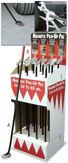 | This popular and profitable product can prevent injury and loss. It contains neodymium, the most powerful magnetic material in the world. Prevent costly repairs and pick up nails, nuts, bolts, screws and scrap metal with a pull of up to 65 lbs. A sturdy, 35" steel handle reaches under vehicles, workbenches, tables, etc.