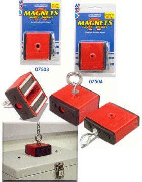 | Add the enclosed eye hook on the top or side of the magnet and use to hold, Lift and hang objects. Each has two powerful ceramic magnets encased in bright red plastic casing with black rubber sides. Includes two Magnetic Shields to block magnetic strength when magnet is not in use. The shields allow easy storage in a toolbox without attracting other tools. Hundreds of uses are possible! |